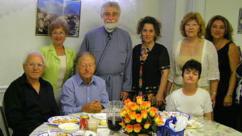 ![]() Persons enjoying the St. Markella Luncheon at the Transfiguration church in Mattituck include: Mrs. Peter Phillips (standing left to right), Rev. Dionisios Marketos, Presvitera Marketos, Argyro Mavrikos, Kalliopi Vournou, Gregory Sitaras (sitting left to right), Elias |