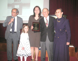 ![]() Mr. Christos Papoutsy (4th from left) presented award from his village of Vatousa, Mytilene, as Michael Christodoulou (left to right), President of Mytilenean Society, Elizabeth Kamviselis Verwoert and her daughter Sophia and Mary Papoutsy look on. |