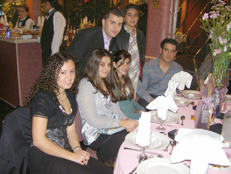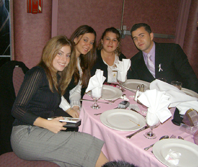 "Community service is part of our college experience at St. John's," said Greek Club President Irene Zouroudis. "Our society is involved in philanthropic causes, besides having fun." The SJU Greek Club was responsible for the fabulous success of the St. John's University Second Annual Evening of Greek Cuisine and Culture on October 13, 2006 that attracted 300 persons. Their hard work, organization skills contributed to a remarkable evening. (Photo at right: Haroula Scoufaras, Julie Kourkoumelis and sister with Tony Katsigiannis enjoying the evening.) |