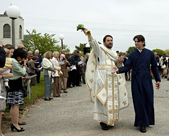 ![]() Presbyter Fr. Constantine Lazarakis blessing community of the Kimisis Church assisted by Ed Earle. Photo by International/ Southampton photographer Stavroula Raia. |