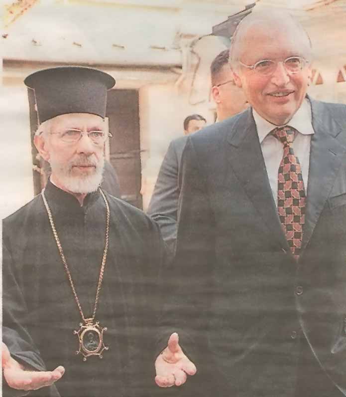 ![]() Greek Orthodox Metropolitan Meliton of Philadelphia escorts former EU commissioner Guenther Verheugen during his visit to the Ecumenical Patriarchate in Istanbul on 9 September 2004 |