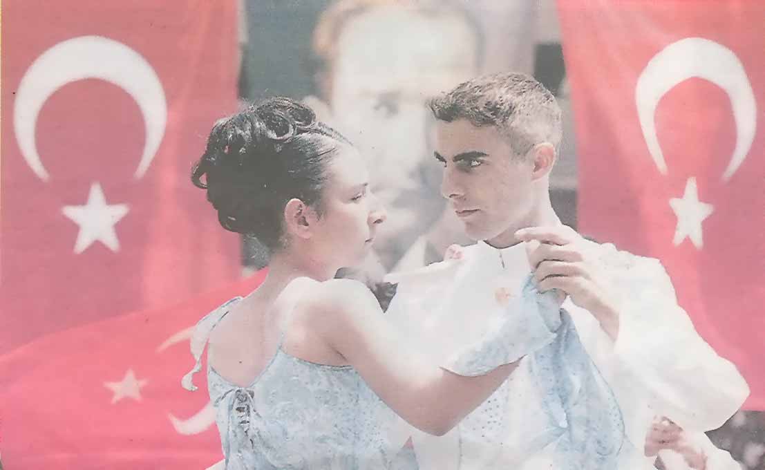 ![]() A couple dance in front of giant turkish flags and a huge poster of Ataturk, founder of the Turkish Republic, during an event at Inonu Stadium, downtown Istanbul, last May. As their country braces for the start of entry talks with the European Union in October, Turks are looking for their identity between Asia and Europe |