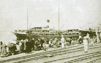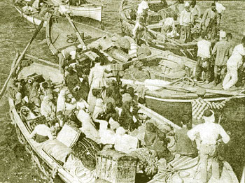 ![]() Refugee-laden ship departing from railway dock of Smyrna. British sailors in white uniforms were helping with crowd control during embarkation. ![]() Transport boats ferry homeless people from Smyrna's burned areas to rescue ships anchored in open sea. |