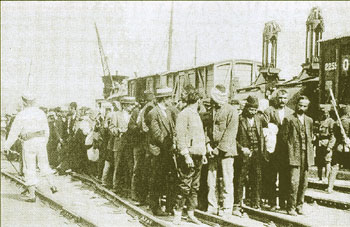 ![]() The Last Obstacle at Smyrna's Harbour--The railway dock, approximately 400 metres long, with a lot of rails along the harbour. Those who wanted to leave, after thronging to reach the head of the dock, also had to pass 4 check-points, where Turkish soldiers would cull out those who did not have permission to travel. At each check-point, those who could not leave were guided back to the captives' queues. They waited there until they would be transferred to somewhere else. On the left, the captives and the Turkish solders who were guarding them can be discerned. On the right, another group consisting of women and children carrying packages on their backs was preparing to embark on the ships. Those who were to embark had to pass through a body inspection and paper check four times. A British sailor was standing next to the telegraph pole in the foreground, while a little behind, at the gate, an American sailor was standing at the checkpoint. |