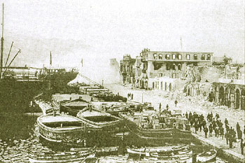 ![]() The dynamiting of buildings along quay following the conflagration and massacres in Smyrna. |