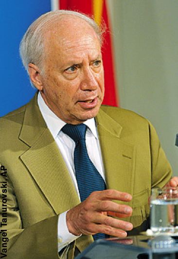 ![]() UN envoy Matthew Nimetz addresses the media at the end of his visit to FYROM's capital Skopje on August 21, in a fresh bid to end the Macedonia name dispute between Fyrom and Greece |