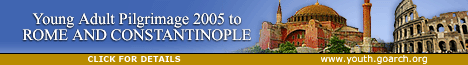 The registration and deposit deadline for the National Young Adult Pilgrimage has been extended until August 12, 2005. The additional $50 dollar late fee will also be waived if registration is postmarked by this extended date. Please keep in mind that this is the last chance to register at the reduced airfare rate. Registration after this date may include additional airline fees. Space is limited so make your reservation today for this amazing experience! All pertinent information can be found online at www.youth.goarch.org, including a Registration Packet available for download. If you have any questions about the pilgraimage, feel free to contact the Department of Youth and Young Adult Ministries [Atlanta Metropolis] at 646.519.6180 or youthoffice@goarch.org. |