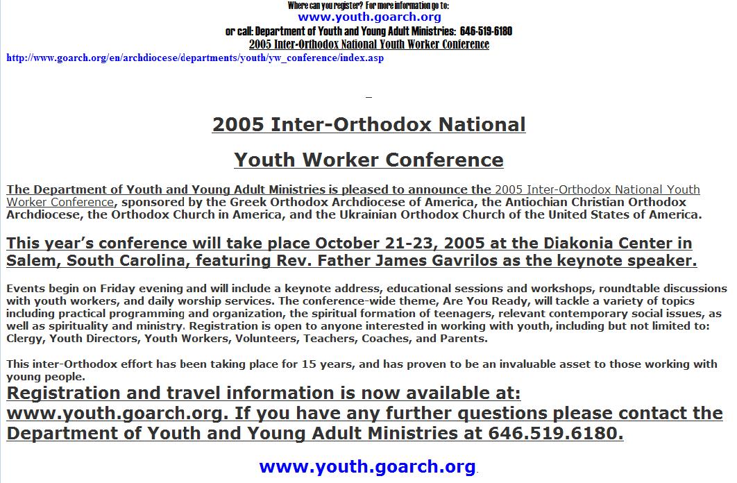 For more information about the Department of Youth and Young Adult Ministries of the Greek Orthodox Archdiocese of America, contact the ministry at 83 Saint Basil Road, Garrison, New York 10524, Tel: 646.519.6180, Fax: 646.519.6191, e-mail: youthoffice@goarch.org; web: www.youth.goarch.org. For a list of events sponsored by the department, visit the department's list of events at the URL http://www.yal.org/Events/. |