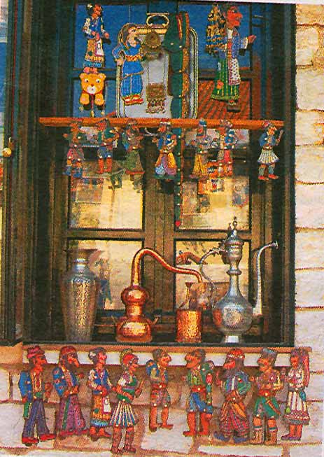 ![]() Display of Karaghiozi figures and hookahs at a local shop |